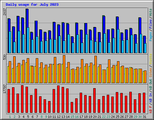 | Day | Hits | Files | Pages | Visits | Sites | kB F | kB In | kB Out | ||||||||