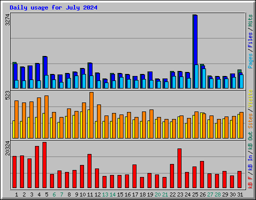 | Day | Hits | Files | Pages | Visits | Sites | kB F | kB In | kB Out | ||||||||