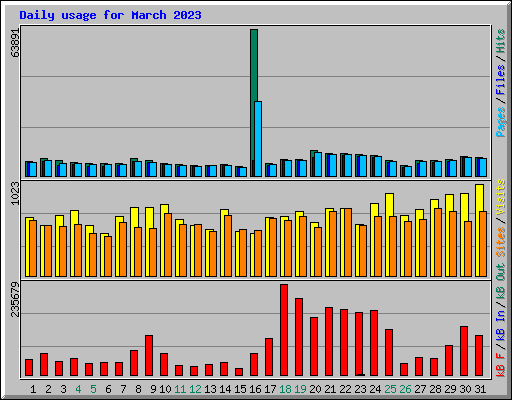 | Day | Hits | Files | Pages | Visits | Sites | kB F | kB In | kB Out | ||||||||